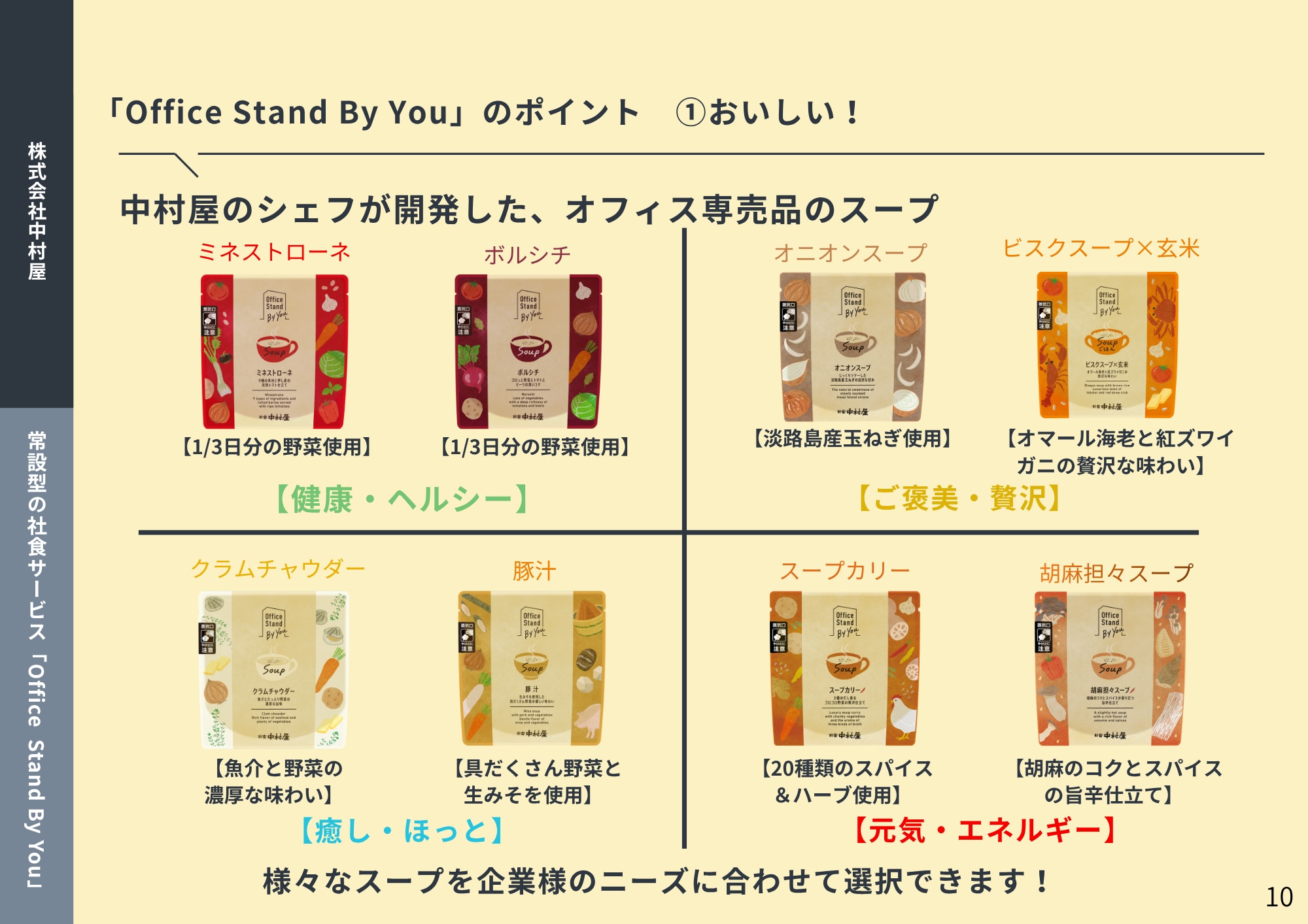 新宿中村屋が提供する、素材の味を引き出したスープをオフィスで手軽に利用できる常設型の社食サービスです。